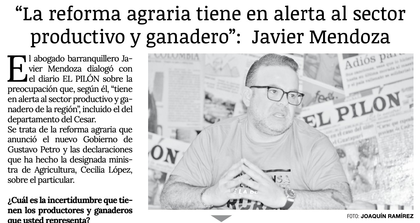 El abogado barranquillero Javier Mendoza dialogó con el diario EL PILÓN sobre la preocupación que, según él, “tiene en alerta al sector productivo y ganadero de la región”, incluido el del departamento del Cesar. Se trata de la reforma agraria que anunció el nuevo Gobierno de Gustavo Petro y las declaraciones que ha hecho la designada ministra de Agricultura, Cecilia López, sobre el particular.